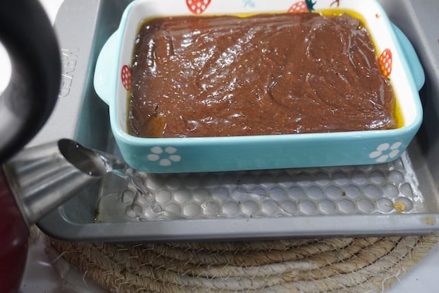 10)Pour boiling water into the bigger baking tray. Fill the water until the water comes half way through the baking pan.