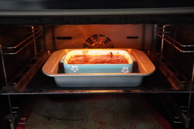 11)Carefully place the pan into the preheated oven and bake for 1 hour.Â