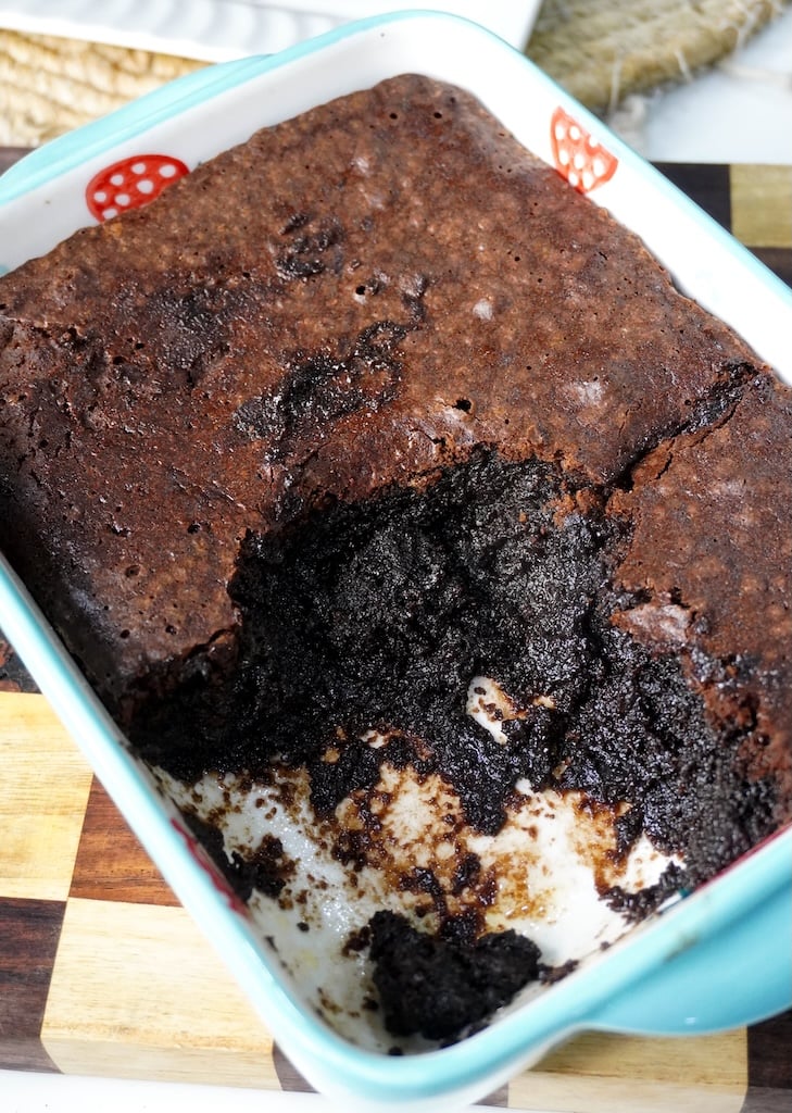 Unlike regular brownies, brownie pudding is intentionally underbaked in the center. This gives it a molten, pudding-like texture instead of a fully set crumb.