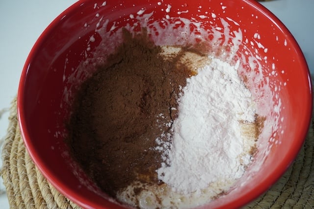 5)Now add in plain flour, cocoa powder and mix using an electric beater until combined.