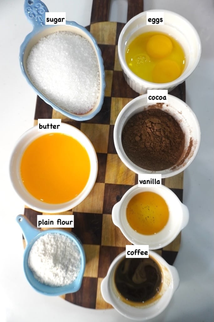 Take eggs, sugar, vanilla extract in a bowl and use an electric mixer to beat this until pale, light and frothy. Now add in the brewed coffee and mix until combine. Now add in plain flour, cocoa powder and mix until combined. Now pour in melted butter little at a time and mix until combined.