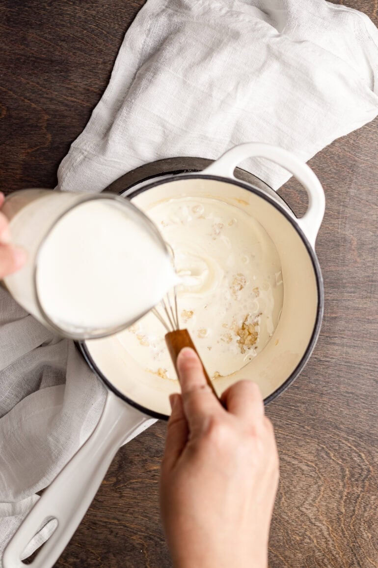 • Heat a small pot over medium heat. Add the butter and whisk in the garlic. Cook for about 30 seconds, or until fragrant and whisk in the flour. Continue whisking the mixture for 30-60 seconds to cook out the flour.