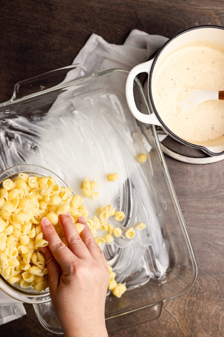 • You also need to make sure to drain the pasta very well before adding it to the casserole. If there’s too much water left on the pasta, it’ll thin out the ranch cream sauce, which isn’t what you want.