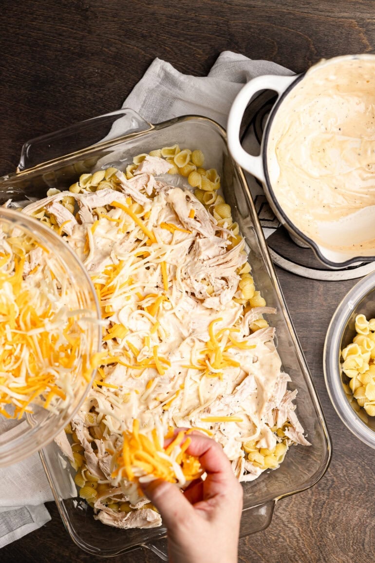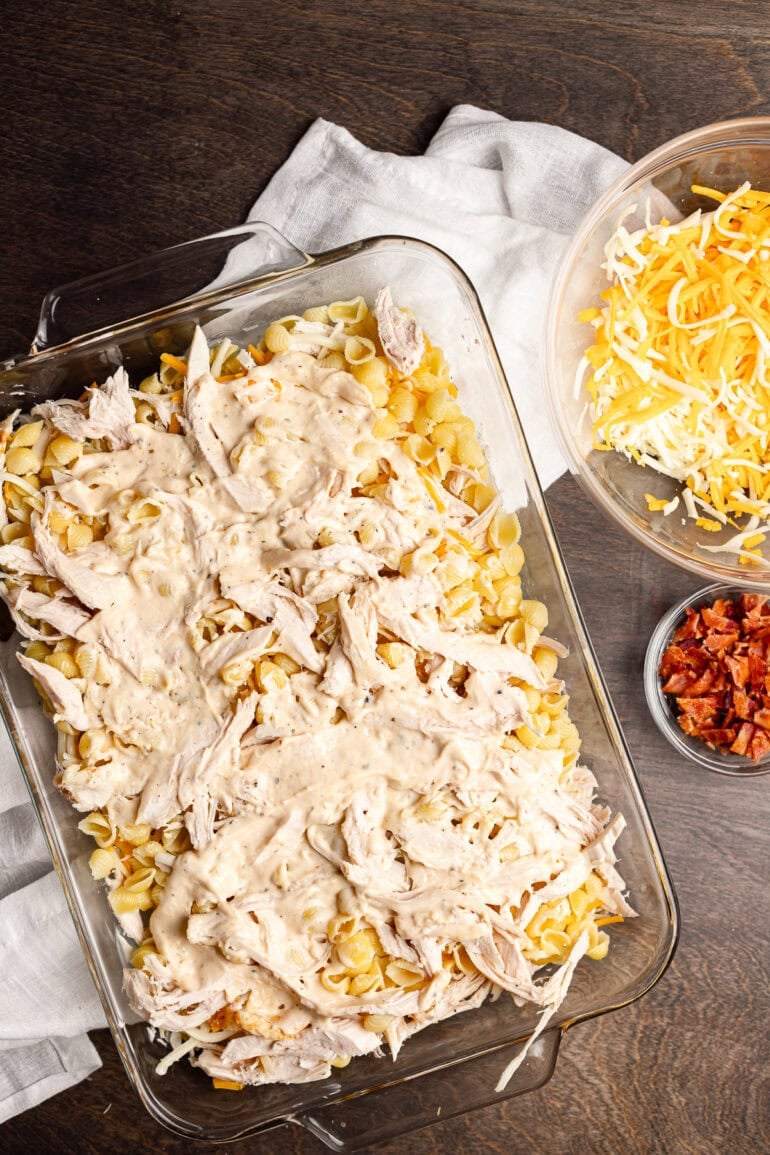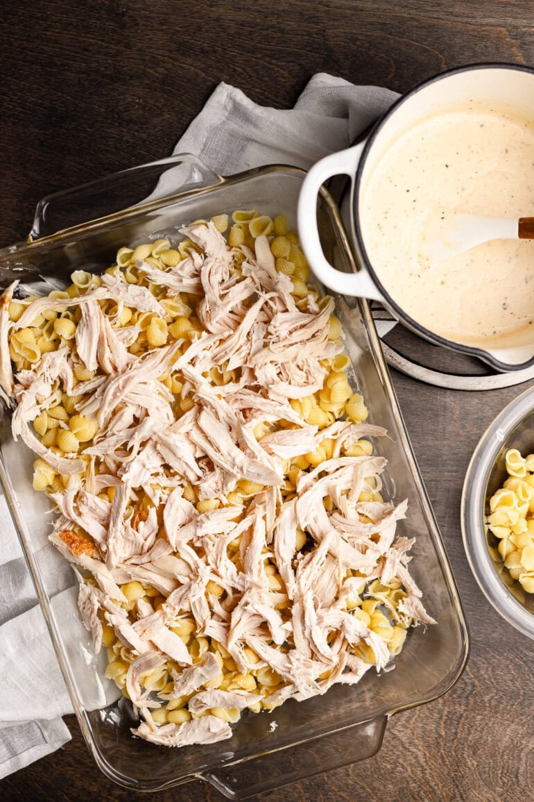 This is a layered casserole with four main components: the ranch cream sauce, the shredded cheese, the chicken, and the pasta. Here’s how to make this easy chicken casserole: