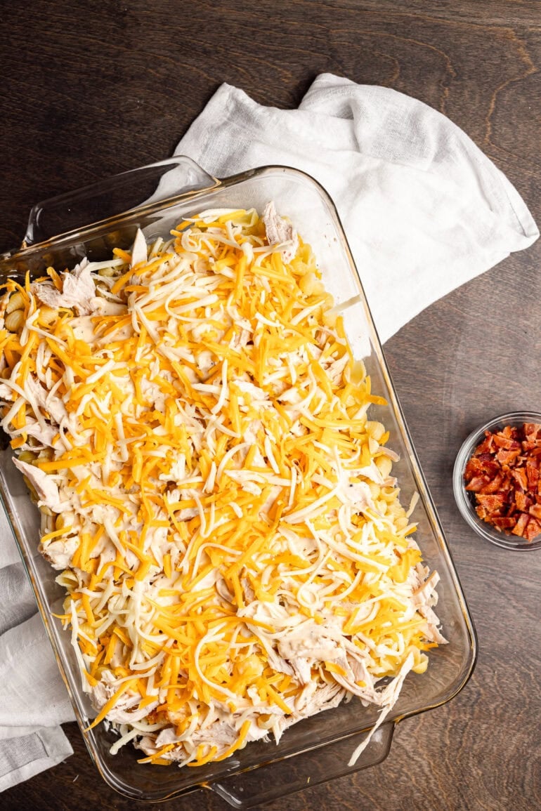 a 9x13 casserole dish full of cheesy chicken bacon ranch casserole with a small bowl of crispy bacon bits on the side