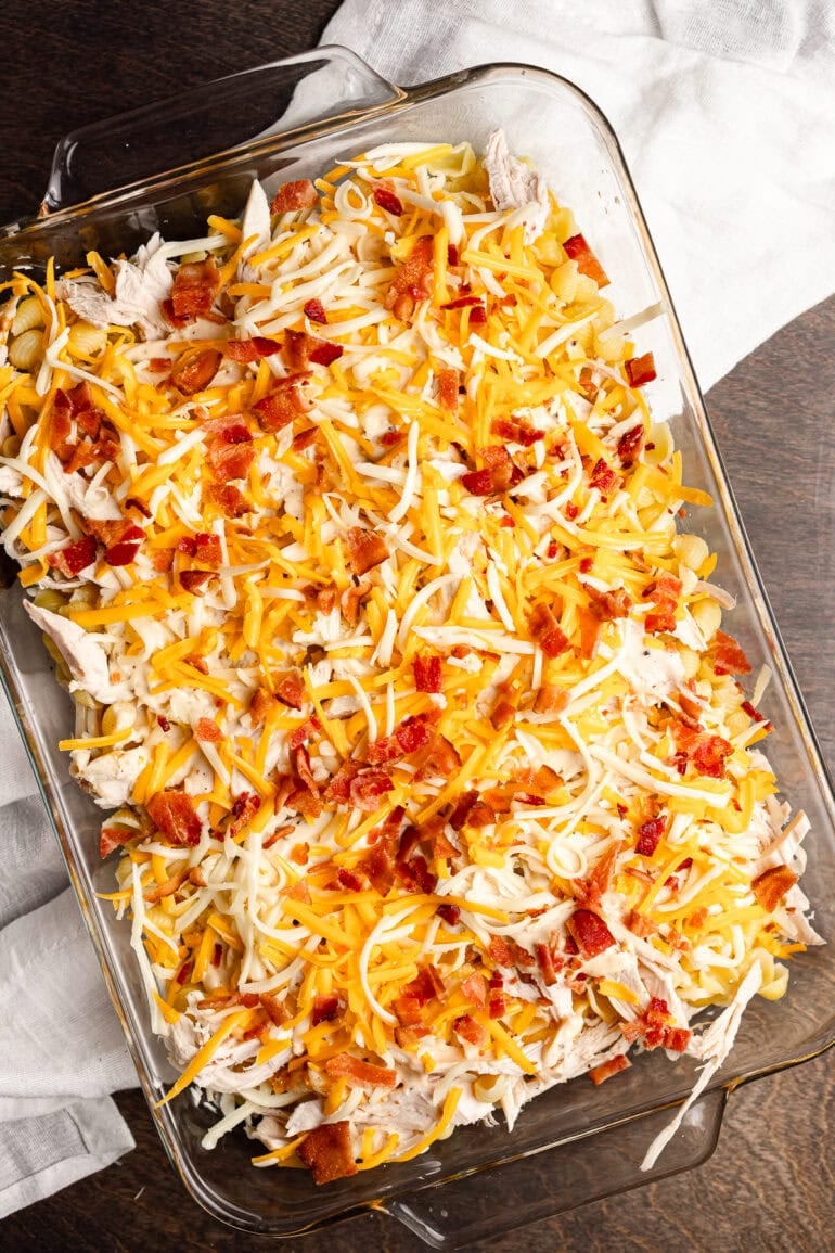 3. Assemble the Casserole: Butter a 9×13-inch casserole dish and assemble the chicken ranch casserole.