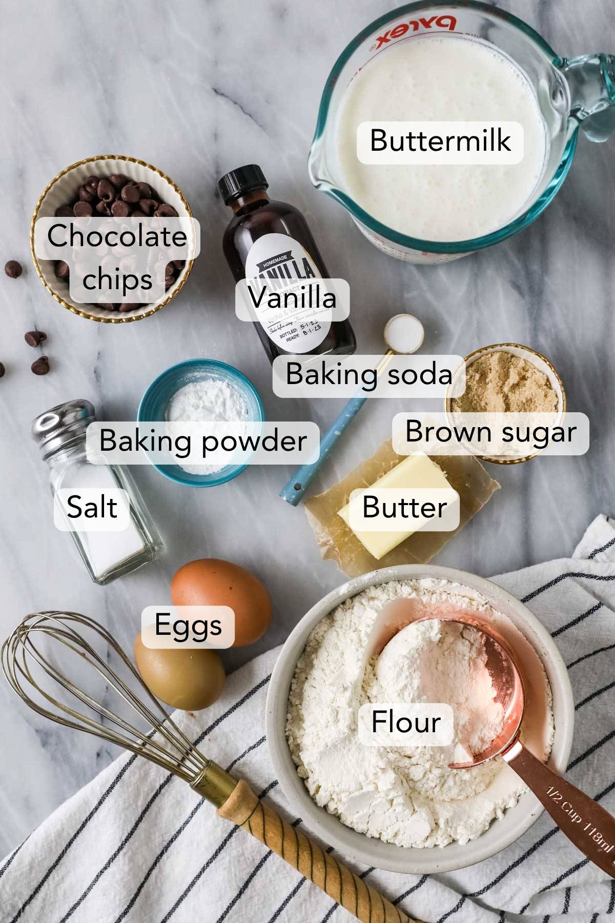 - Vanilla. A hefty amount of vanilla extract complements the chocolate chips nicely and gives the pancakes a bit more of a dessert vibe, which you’d be missing if you simply added chocolate chips to a regular pancake mix.