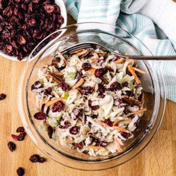 This delicious crisp winter salad is perfect for your holiday or Christmas dinner table. It is ready in just a few minutes and is the perfect side dish for all occasions. The dried cranberries are sour, and the sugar-free sweetener adds a bit of sweetness without kicking you out of ketosis. You also have full control over how sweet you want this tangy cranberry almond coleslaw salad to be!