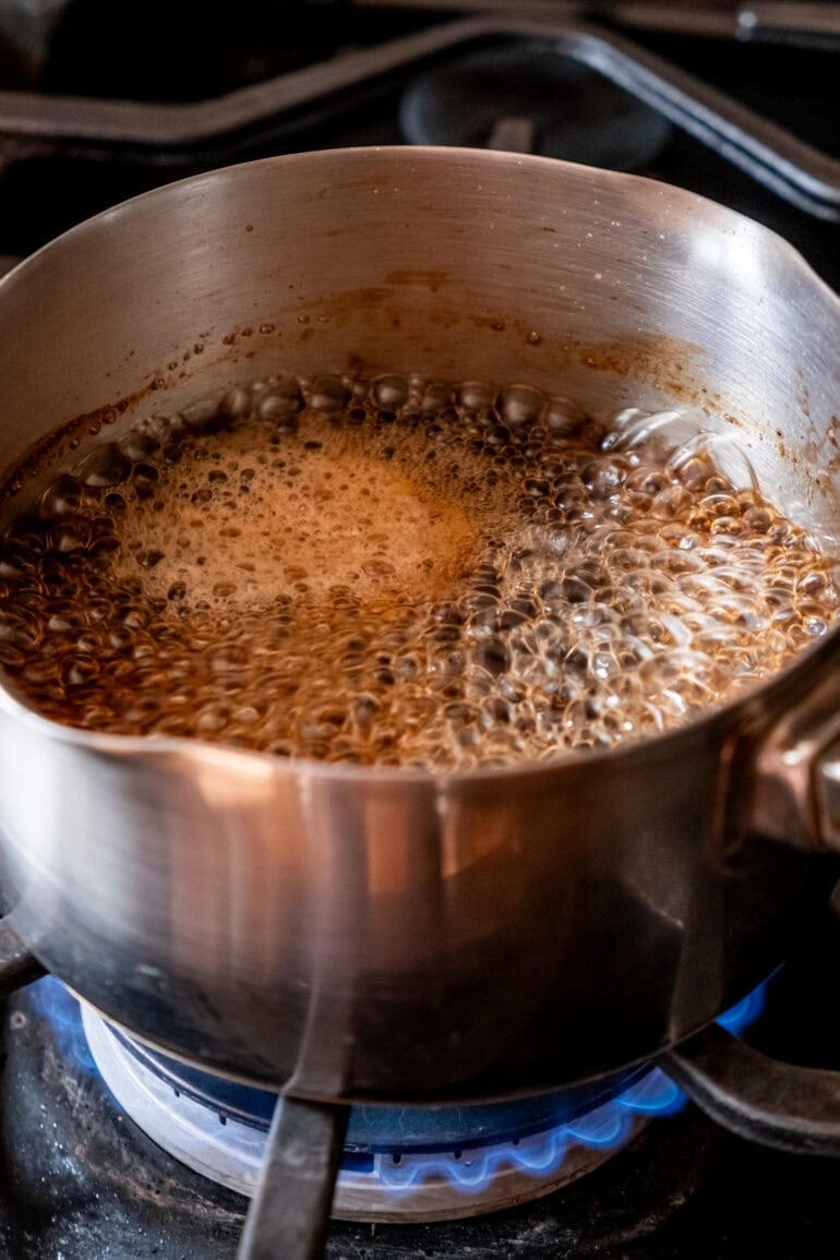- Make the Sauce: Add all the sauce ingredients to a saucepan and stir. Bring to a boil.