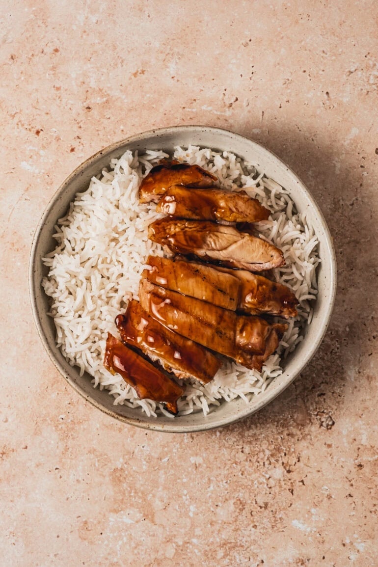 Nine times out of ten, we serve teriyaki chicken with rice. It’s timeless, classic and so delicious! It also goes great with noodles or even just steamed veggies in a teriyaki chicken bowl with veggies.