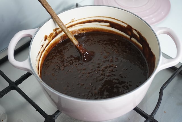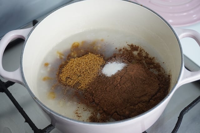 4)Once the rice is cooked, add in cocoa powder, brown sugar and salt. Mix well.