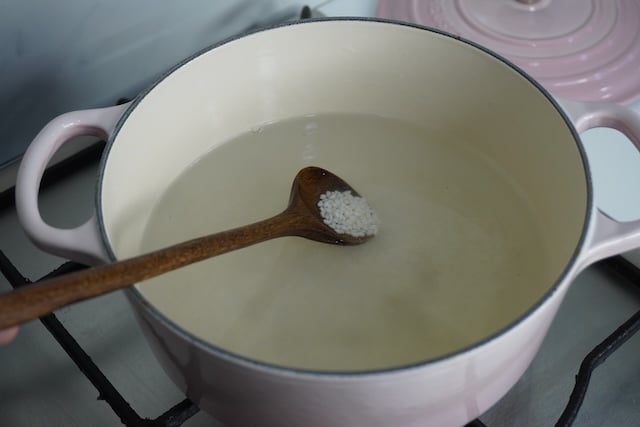 2)In a heavy bottom pan. Pour water and heat till it comes to a full boil. Add in strained rice and mix well. Let it come to a full boil.