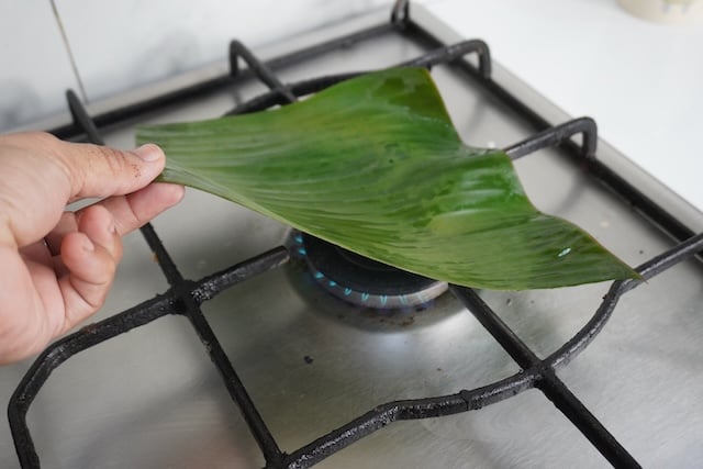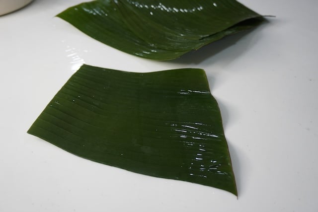Cut banana leaves into small pieces and pass them over a direct low flame until they soften. Spread the cooked sticky rice evenly on the banana leaf and roll like a long strip. Make another roll the same way.