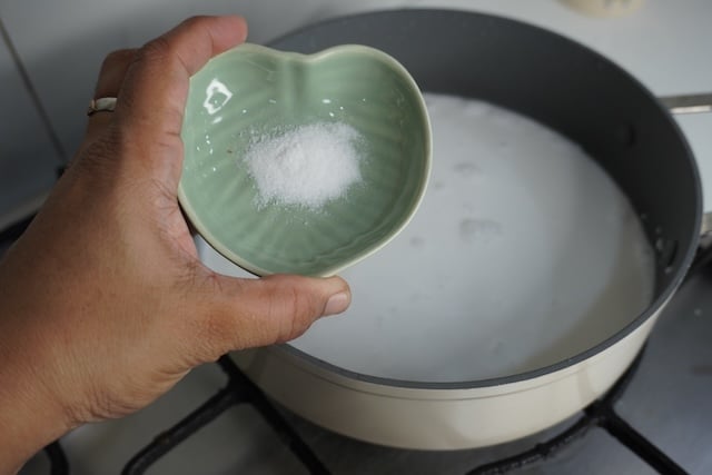 In a pan, heat coconut milk, sugar, and a pinch of salt. Bring the mixture to a boil, then add drained rice. Cook until the rice absorbs all the liquid.