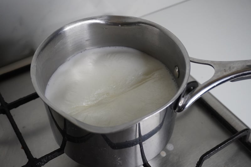 1) Take milk in a sauce pan. Use full fat milk, full cream cow’s milk is best for making greek style yogurt. Once you add milk to sauce pan. Place it on heat and bring it to a boil. Once milk starts to boil.