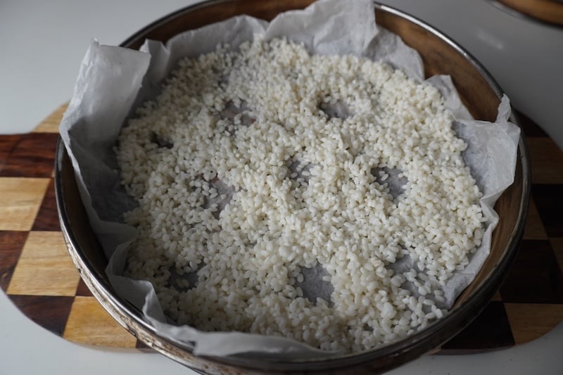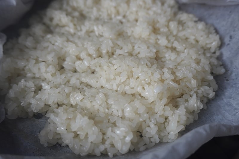 4) Spread the rice over the parchment evenly. Make multiple holes on the rice to ensure even steaming.Â