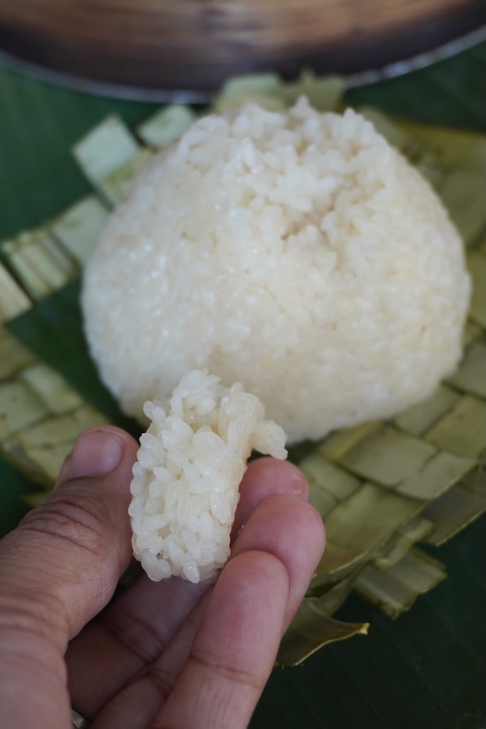 Place the basket over a pan of hot water. Cover and steam for 45 minutes to 1 hour. Make sure to flip the rice using a ladle every 10 minutes for even steaming. After 45 minutes start tasting the rice, it should be cooked, with slight chewy texture. This means your rice is cooked. Remove the steamer basket carefully from the steaming pot.