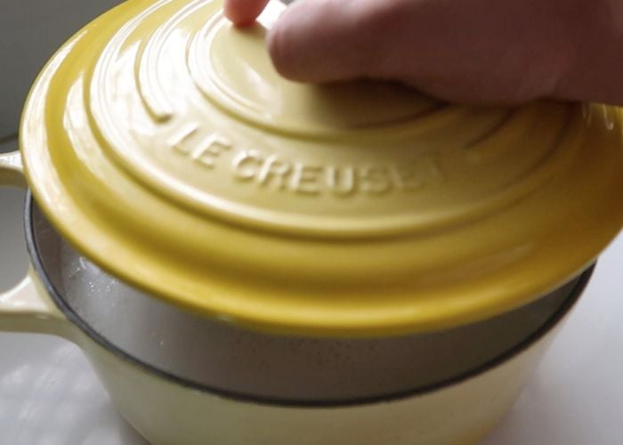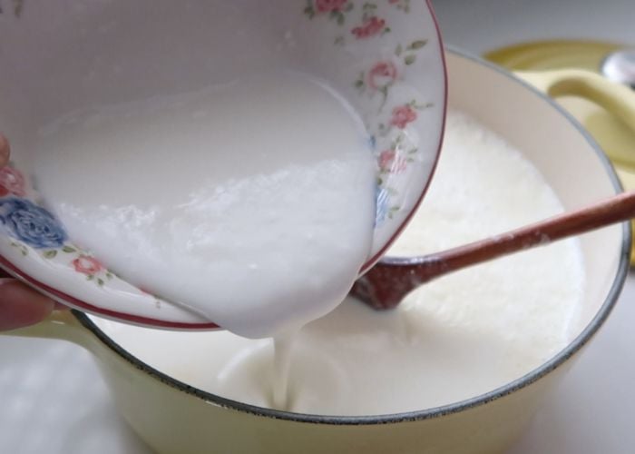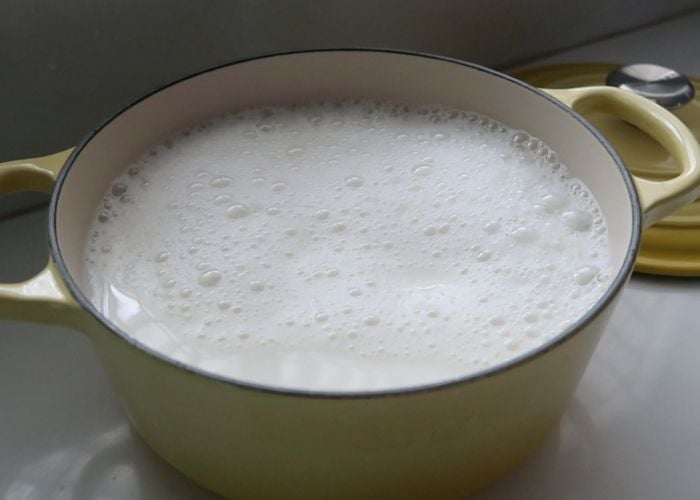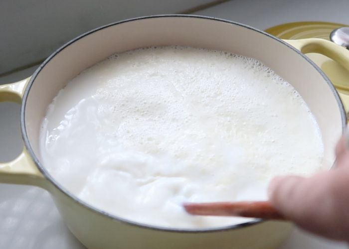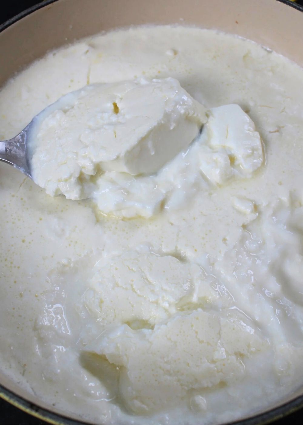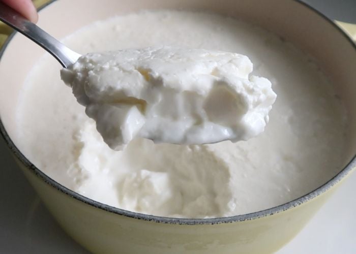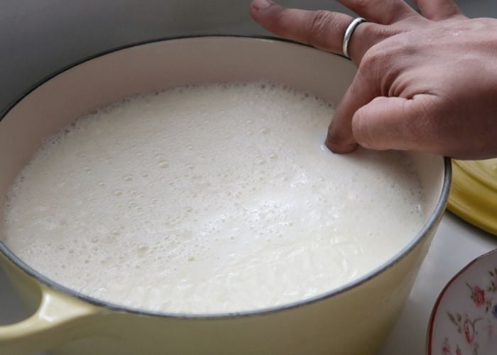 So make sure your milk is warm when you add the starter curd in. Another way to find the temperature of the milk is. If you dip your finger into the milk, it should be like a very warm bath, if it is too hot then you should allow the milk to cool completely.