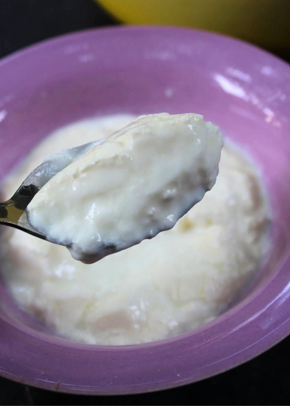 The process is very simple, heat milk, mix starter with milk and leave to ferment. After fermentation you will get a perfectly set thayir or yogurt.