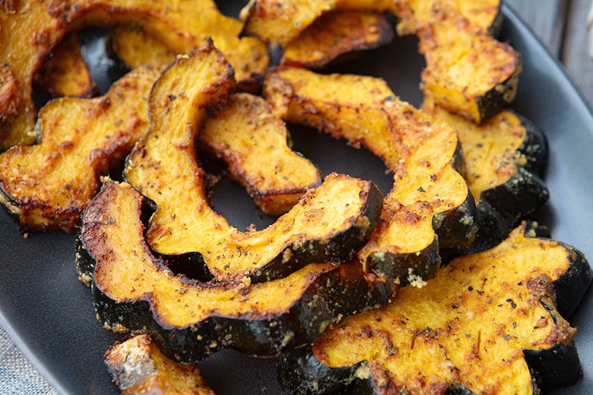 - Turn the squash wedges over, and sprinkle on the Parmesan. Continue roasting for 15-20 minutes until the cheese is golden and melted and the squash is tender.