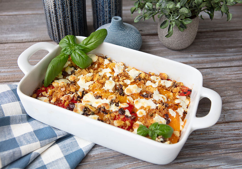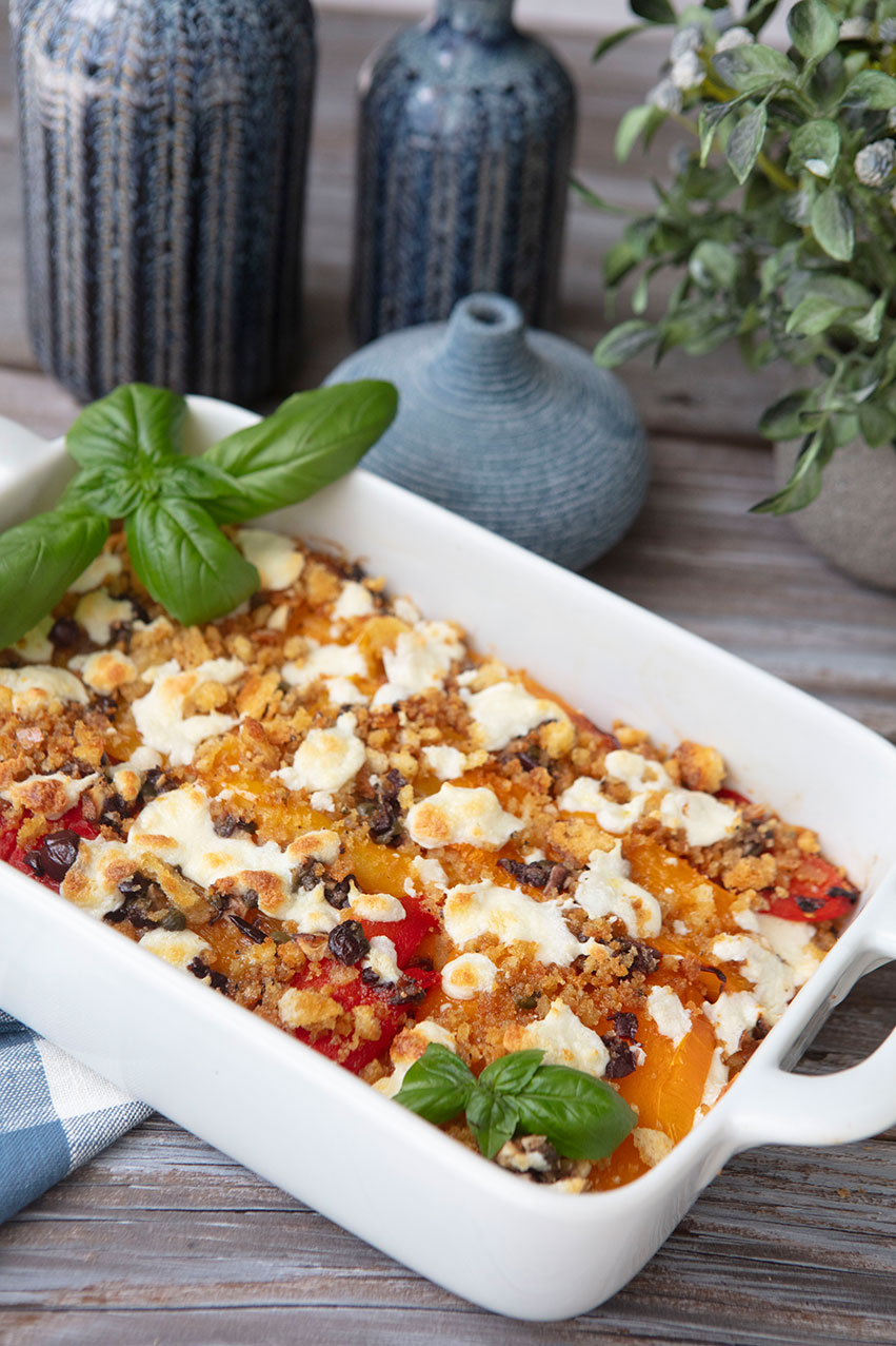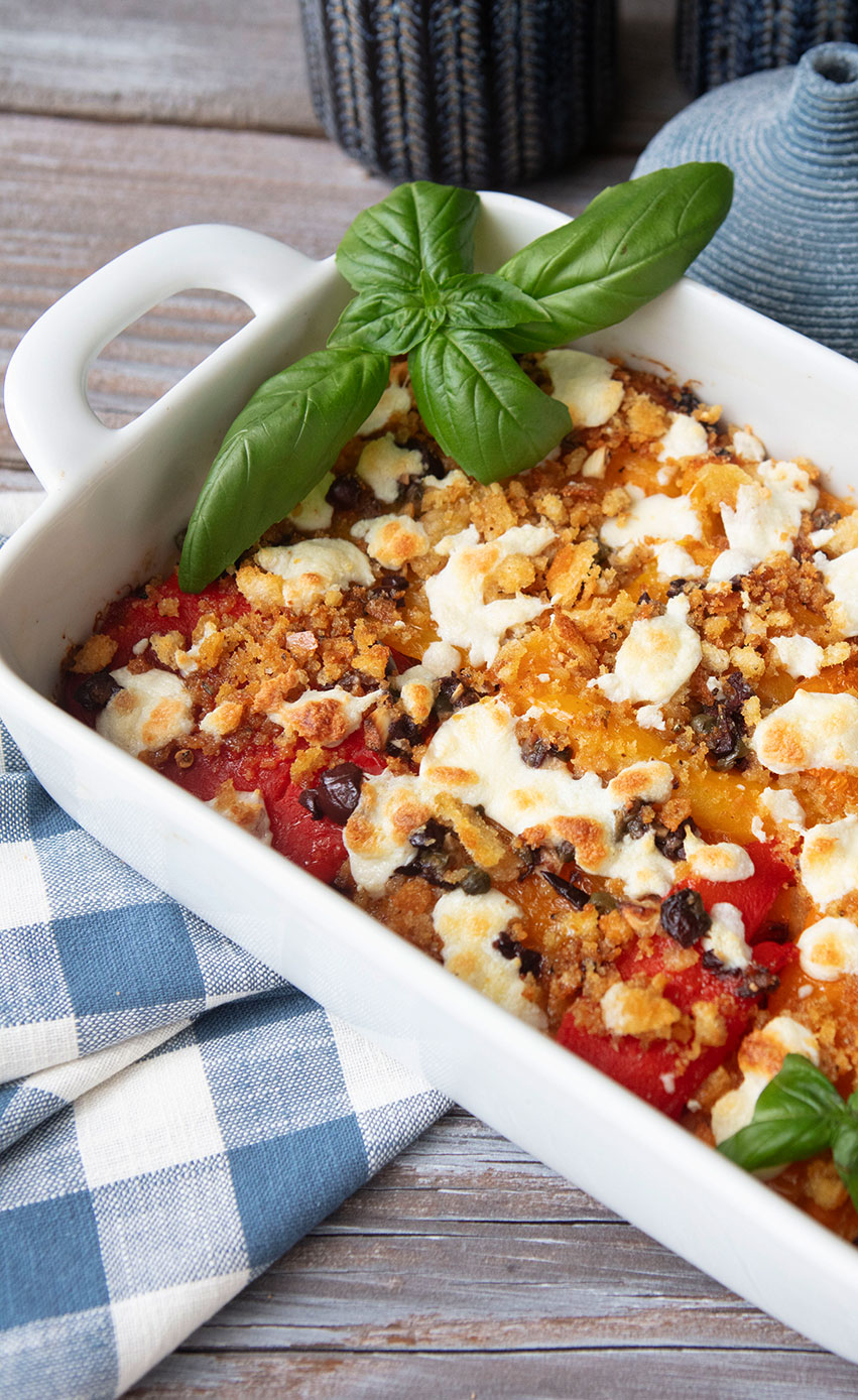 Colorful bell peppers are one of my favorite vegetables to cook with because they bring both vibrant color and natural sweetness to so many dishes. I roast them, grill them, stuff them, or enjoy them raw in salads, and they never disappoint. In this simple gratin, the peppers remain the stars of the dish, while a few bold Mediterranean flavorings; garlic, olives, and capers thatadd depth and savoriness. A light, crisp breadcrumb topping brings everything together with just the right amount of texture.