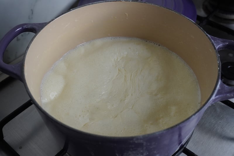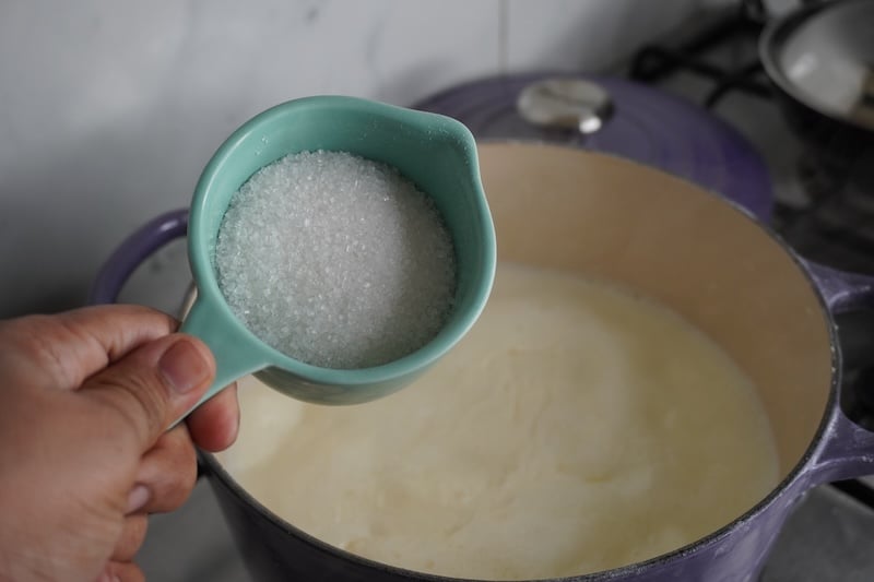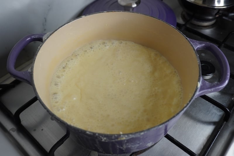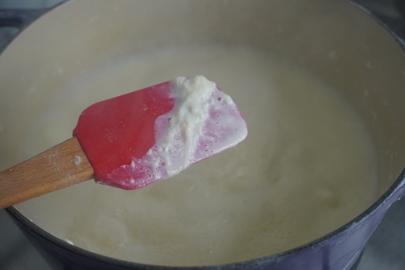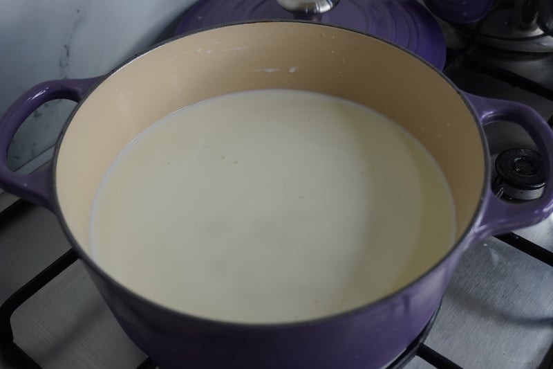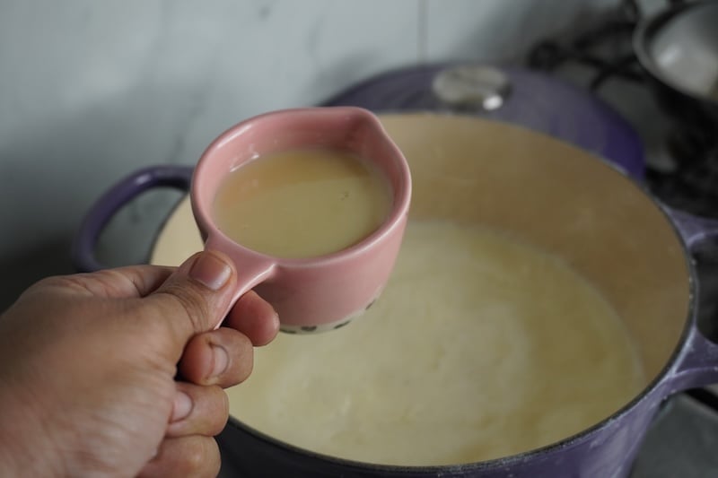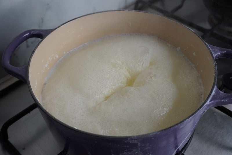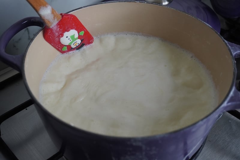 3)Boil the milk while scraping the sides of the pan to remove the milk solids formed when boiling milk.