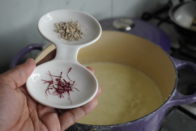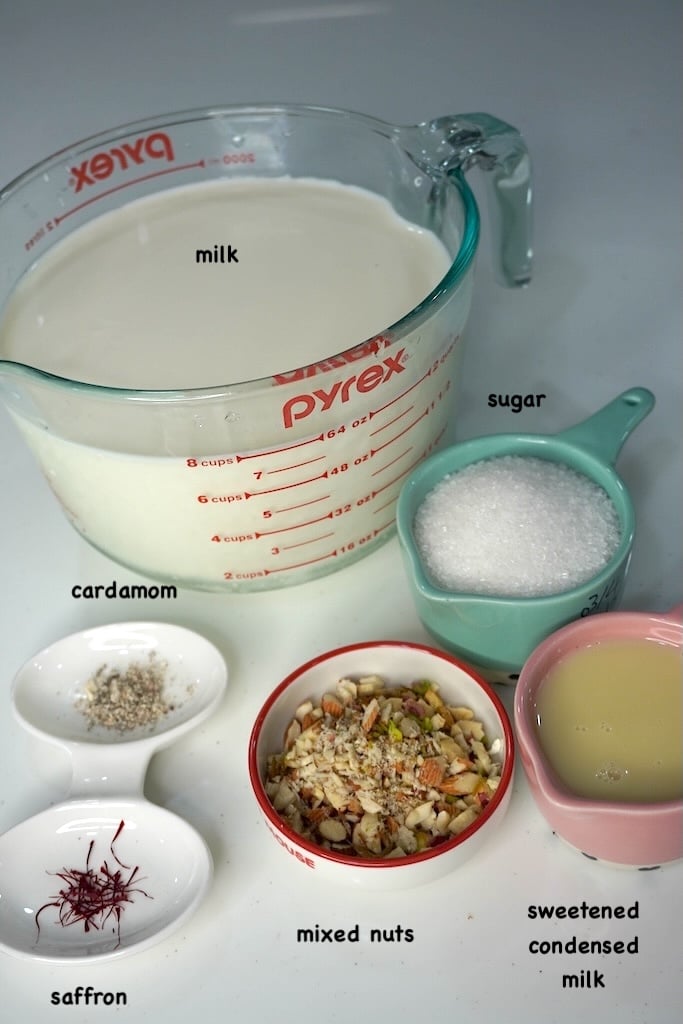 Flavourings – cardamom and saffron are the flavourings which I used. But you can use kewra or rose water as wel.