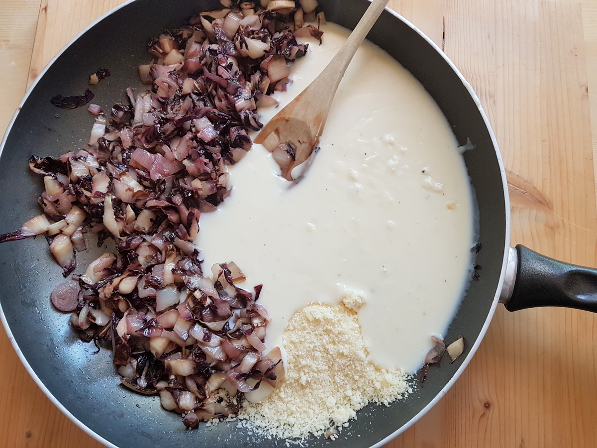 4) Add some béchamel and grated Parmigiano to the cooked radicchio and shallots. Mix everything together.
