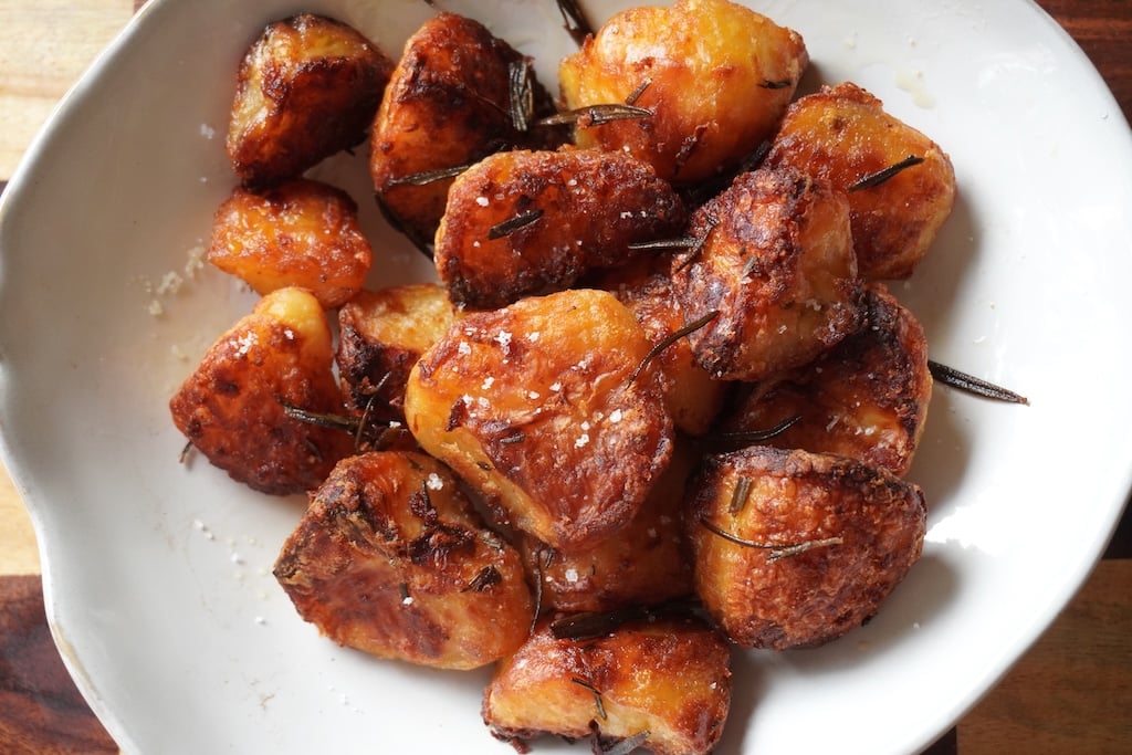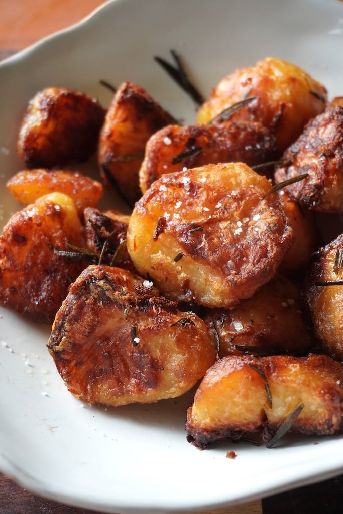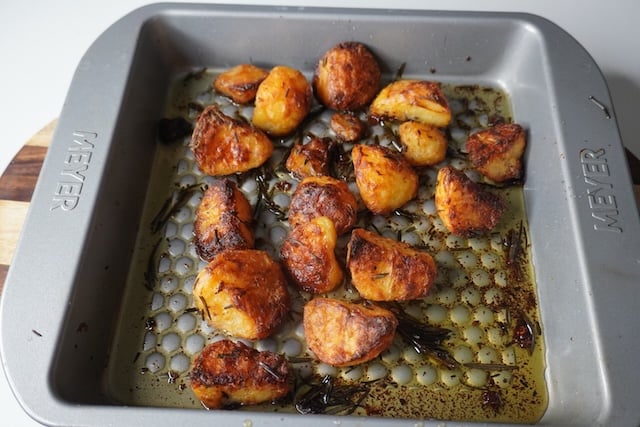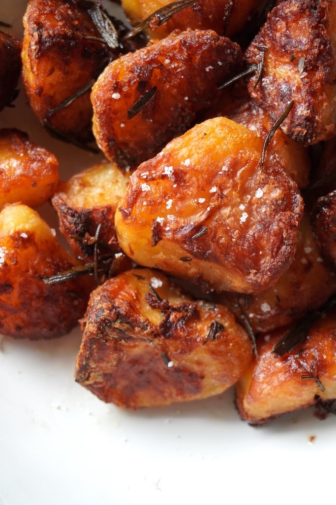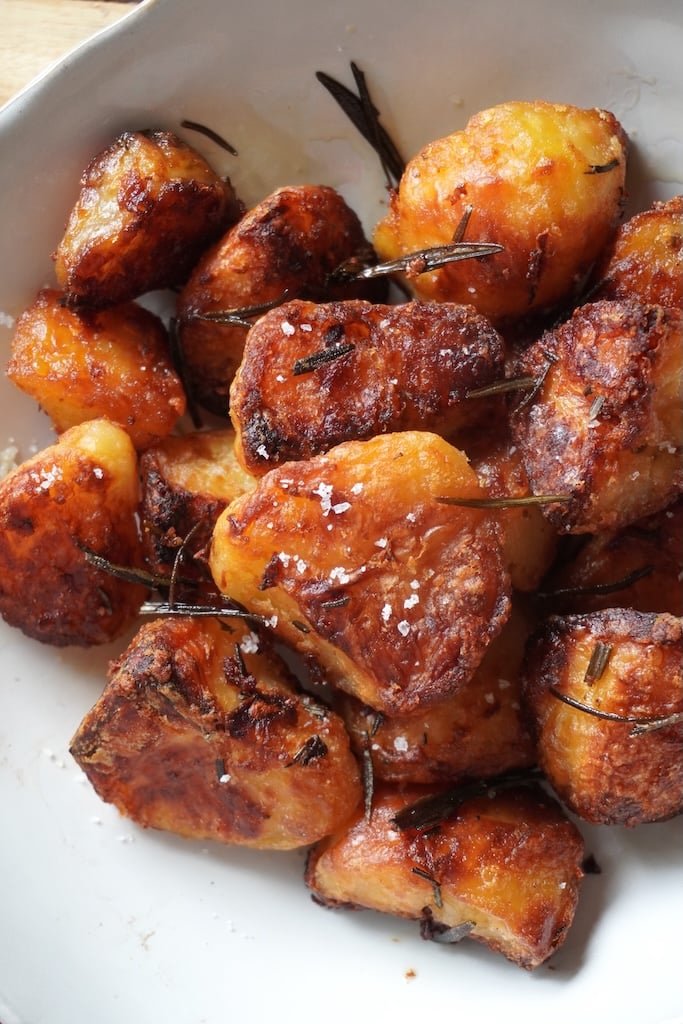 Potatoes – The best potato for roasting is a starchy or all-purpose variety, because you want a fluffy inside and crispy outside. Russet, Yukon gold, Maris Piper / King Edward are best choice.