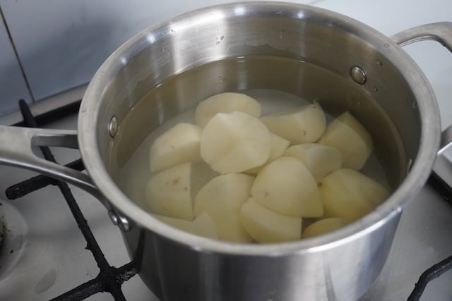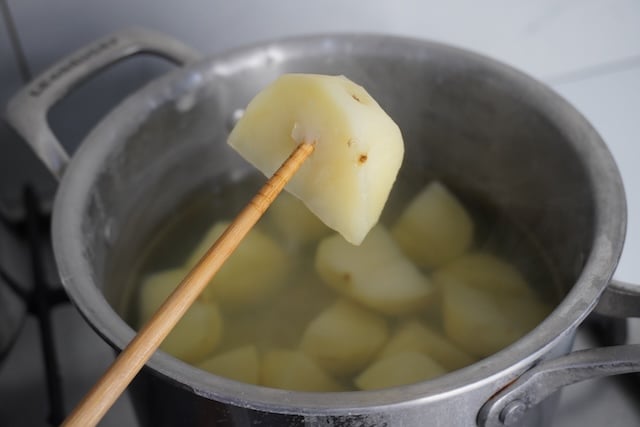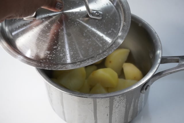 8)Once the water boils, cook it for 3 to 5 minutes until you can insert a chopstick into the potatoes easily. Don’t over cook the potatoes else it may get mushy.Â
