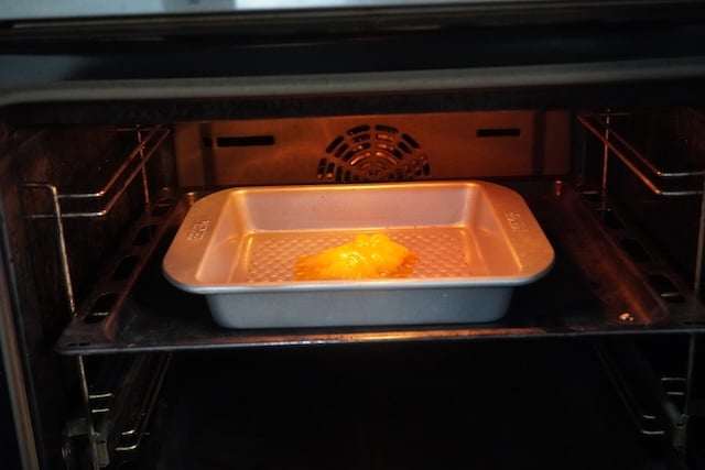 2)Place the pan into the oven and let the ghee gets hot as you prepare the potatoes.Â