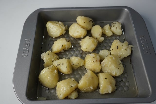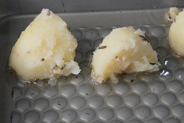 Baking Soda – Add baking soda makes the water alkaline which helps with the roasting which results in crispy crunchy roast potatoes.Â