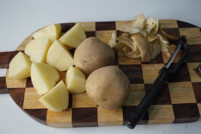 3)Peel potatoes using a vegetable peeler. Cut each potatoes into quarters.Â