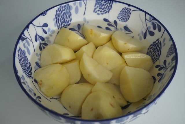 Peel potatoes using a vegetable peeler. Cut each potatoes into quarters. Take the potatoes in a large bowl and wash them with cold water. Let the potatoes sit in cold water for 5 minutes.