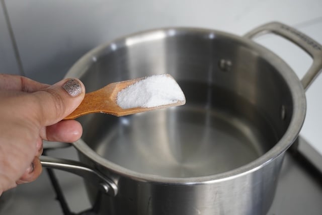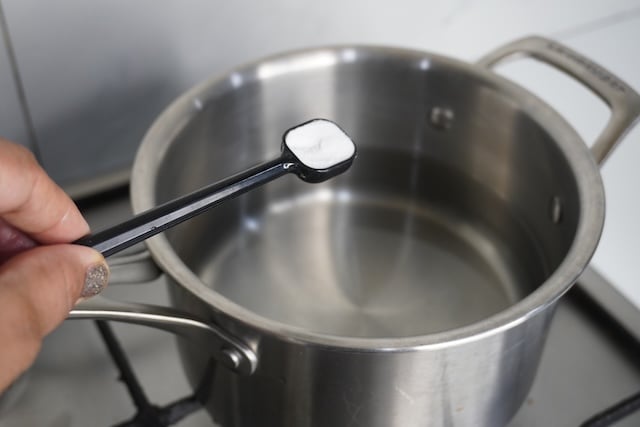 5)Take water in a sauce pan. Add in baking soda. This makes the water alkaline which helps create crispy potatoes.