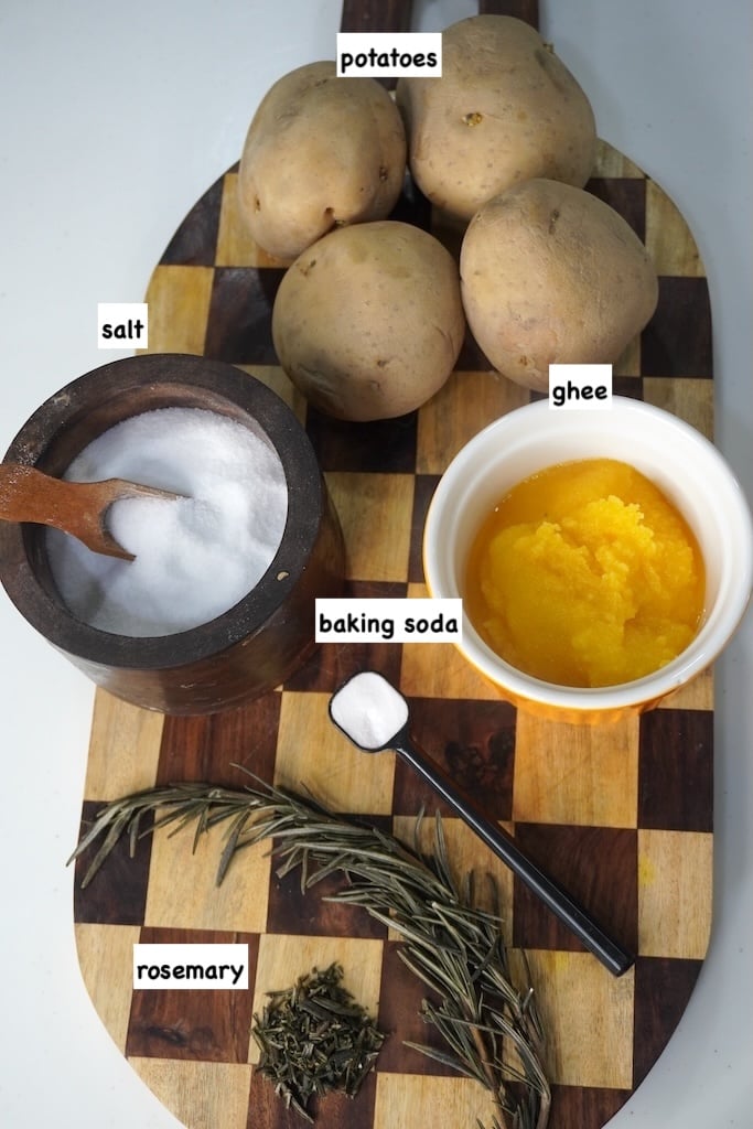 Ghee – ghee which not only has high smoking point. But adds insane flavour to the potatoes which makes it super crispy and flavourful.