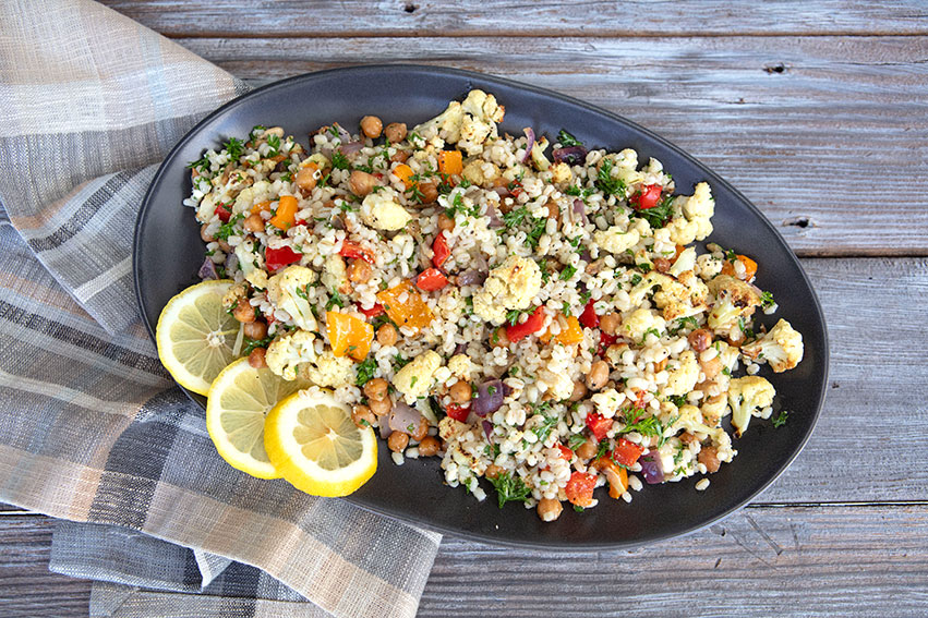 - To build the salad, combine the cooked barley, roasted cauliflower, peppers, and onions and herbs in a bowl with the spiced chickpeas.