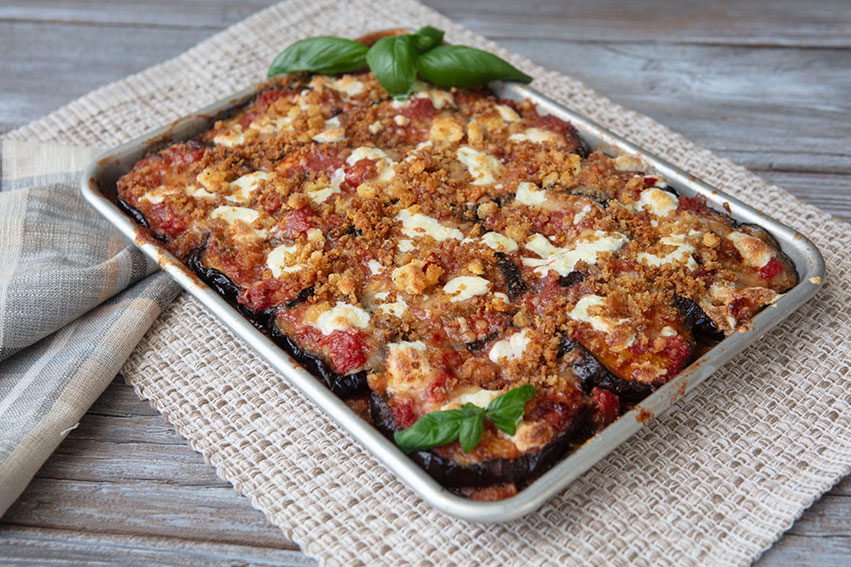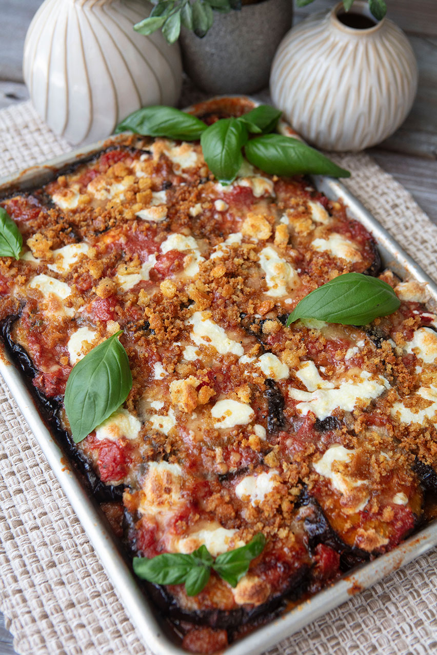 The secret to keeping the dish light and never soggy is twofold: salting the eggplant to draw out excess moisture and giving the slices a quick broil before layering. This extra step concentrates the flavor, ensures a beautifully charred surface, and keeps the eggplant tender but not watery. Fresh mozzarella melts into the layers of eggplant and tomato, while the baked crumbs add that essential Parmesan-style crunch.