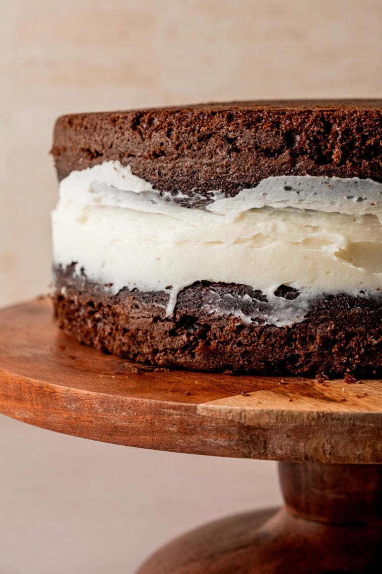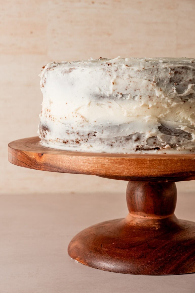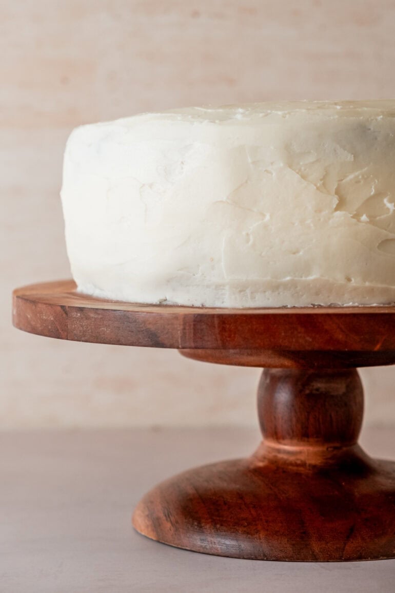 Using an angled spatula, spread a thin layer of frosting all around the edges. Chill the cake for 30 minutes then spread another layer of frosting over the chilled cake