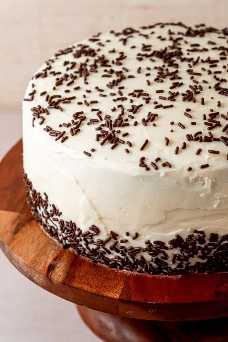 - Finish the Cake: Spread another layer of frosting all over the chilled cake and sprinkle with chocolate sprinkles or mini chocolate chips if desired.