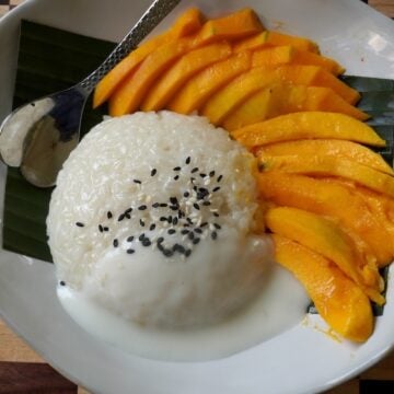 Thai sticky rice aka glutinous rice is traditionally soaked and cooked fluffy. The cooked sticky rice is then covered in a creamy coconut sauce and paired with fresh mangoes. This is a classic, traditional and staple dessert in Thailand. Thai sticky mango is also known as “Khao Niew Mamuang” in Thai.