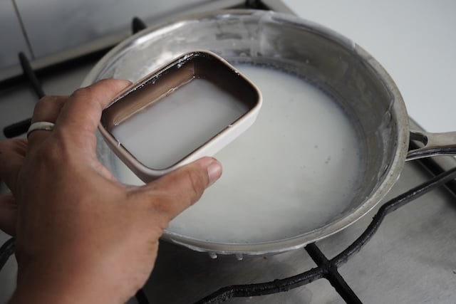 Take coconut milk, sugar and salt in a pan. Bring this to a full boil. Once the coconut milk starts boiling, reduce the heat and cook for 2 minutes. Now remove ¼th of the coconut milk in a separate bowl. We will use this for serving.