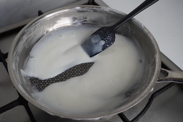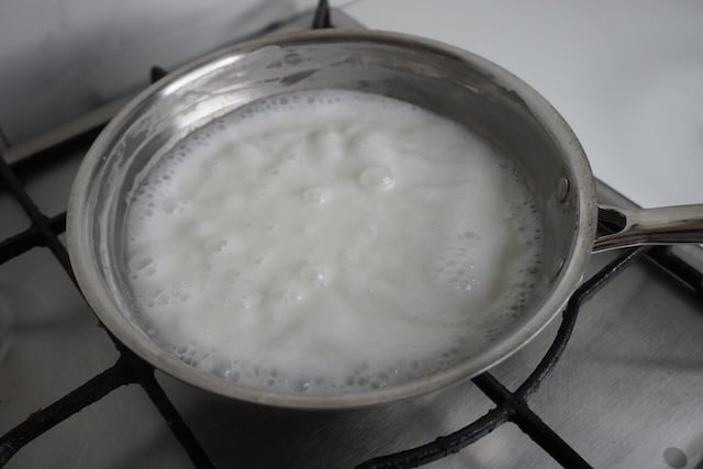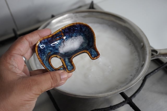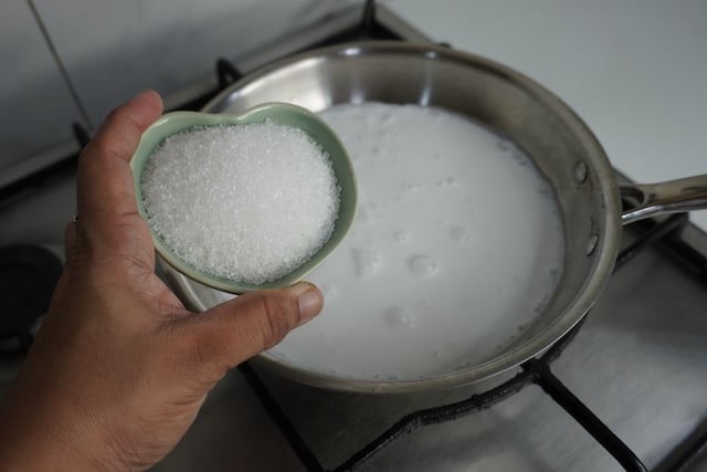 9)Take coconut milk and sugar in a pan. Cook on medium heat.