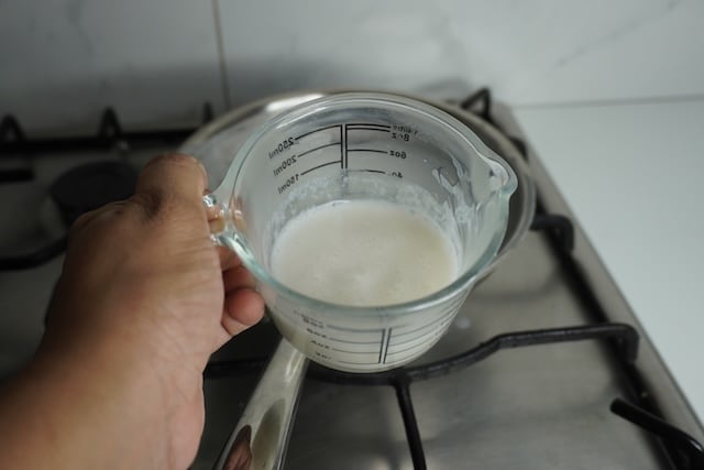Now lets thicken the sauce. Mix 1 teaspoon cornstarch with some water. Take the reserved ¼ of the coconut milk in the same pan. Add the cornstarch slurry and cook until thicken and glossy. Your coconut sauce is ready.