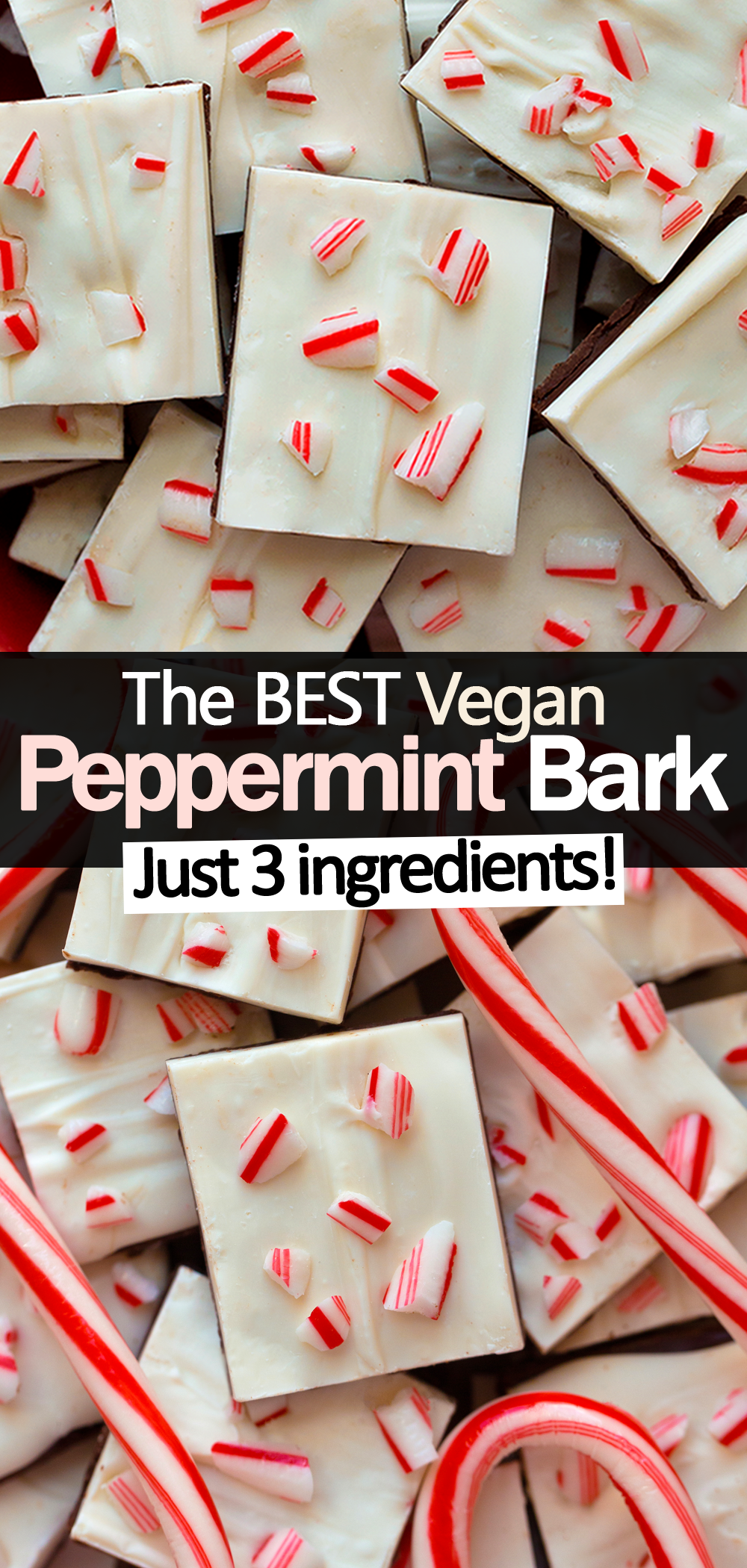 It’s so easy to make your own layered white and dark chocolate vegan peppermint bark at home, with this quick 3 ingredient recipe!