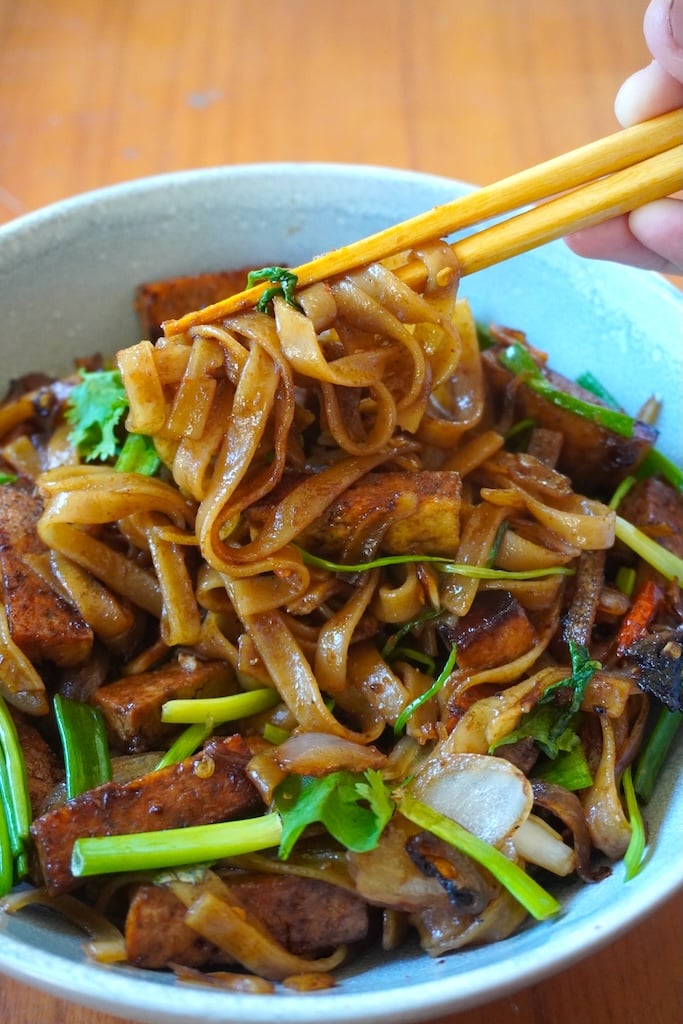 This vegetarian version is just as irresistible, loaded with flavour. Try to find wide rice noodles such as Pad Thai noodles. The slippery rice noodles soaks up every bit of the sauce. And the noodles is generally spicy in taste which makes it addictive.Â