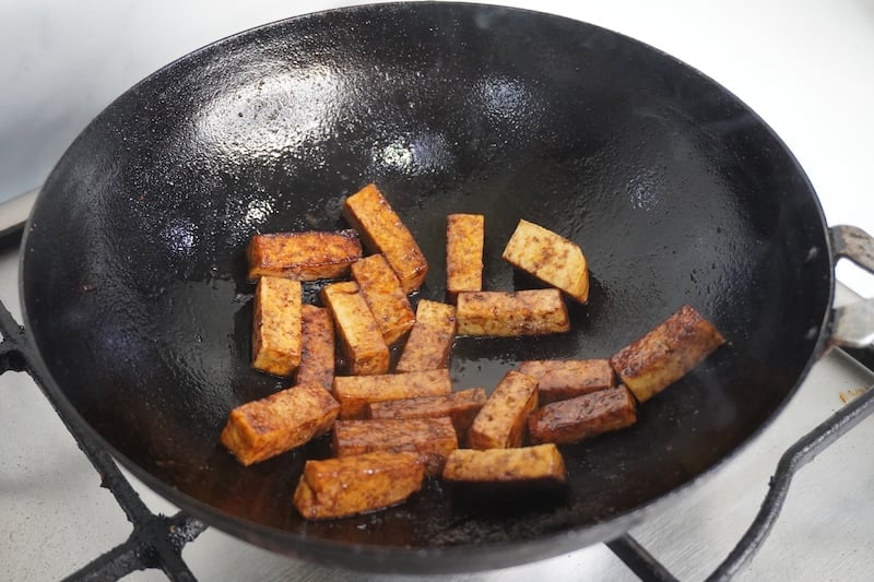 9)Add in fried tofu cubes and toss well. Taste and adjust the seasoning.