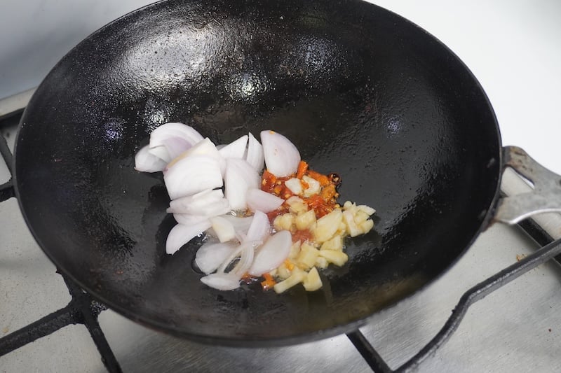 6)In the same wok, pour 2 tablespoon of oil. Add in garlic, chillies and onions.