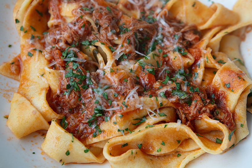 This special pasta is a Venetian specialty, made with duck legs, and the tomato sauce is flavored with cinnamon, orange, and white wine. Pappardelle is a typical pasta to serve with this ragu, but any pasta shape would work just fine. If you are making your own pappardelle, simply roll out your pasta dough thinly, then cut it into one-inch thick strips.